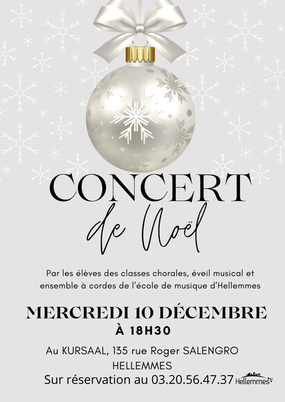 Rendez-vous donc au Kursaal, 135, rue Roger Salengro, le mercredi 10 décembre à 18h30 pour écouter les élèves des classes de chorales, d'éveil musical et d'ensemble à cordes de l'école de musique d'Hellemmes.