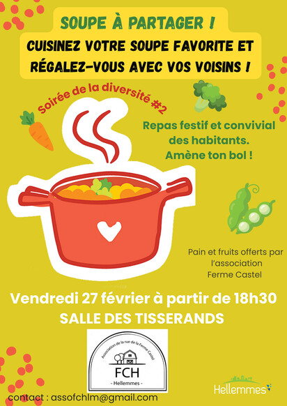 Cuisinez votre soupe et régalez-vous avec vos voisins, le vendredi 27 février à partir de 18h30 dans la salle des tisserands.
