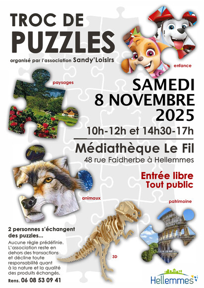 L’association Sandy’Loisirs organise un troc de puzzles, le samedi 8 novembre 2025, de 10h à 12h et de 14h30 à 17h, à la médiathèque le Fil, 48, rue Faidherbe.