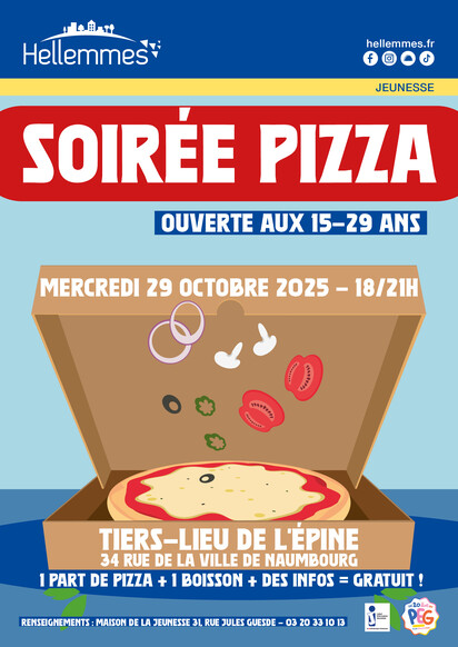 Le mercredi 29 octobre, de 18h à 21h, pour les 19-29 ans, c'est soirée pizza organisée par la Maison de la Jeunesse !